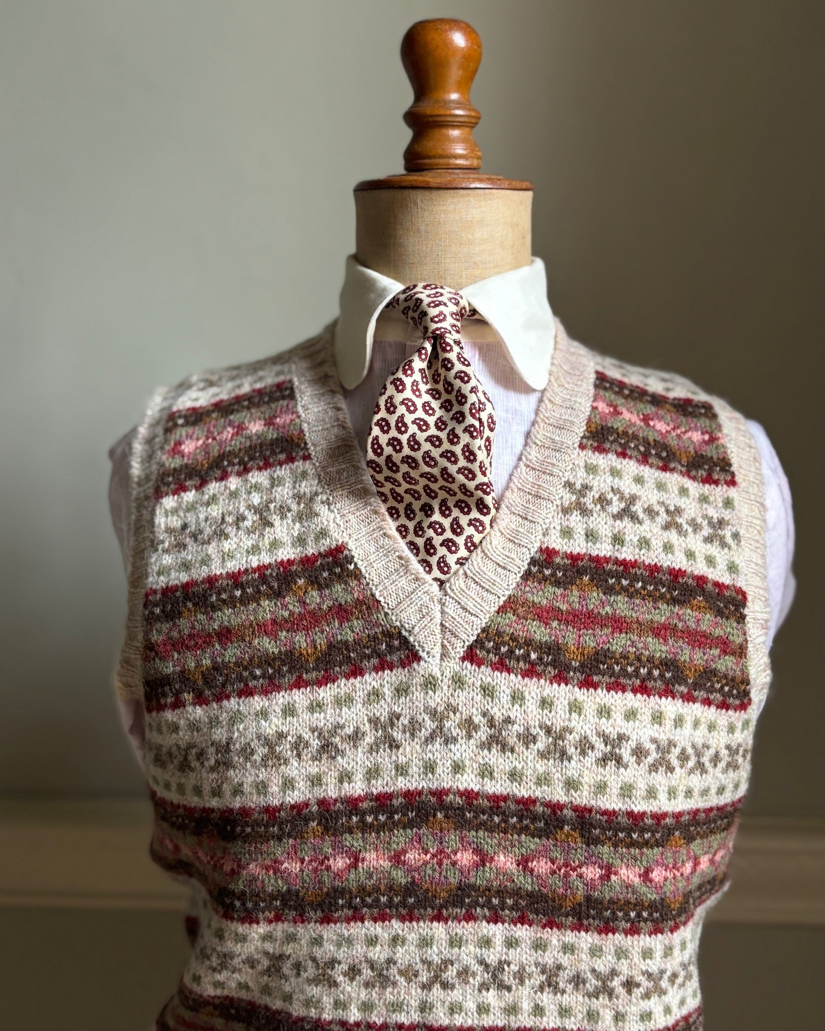 A rather special authentic men's Fair Isle slipover made popular in the 1920s by Royalty. A truly stylish piece as popular now as it was in the 20s. This sleeveless sweater will finish off any vintage golfing outfit, perfect for hickory golf days! Slightly shorter in the body to sit nicely on high waisted trousers.