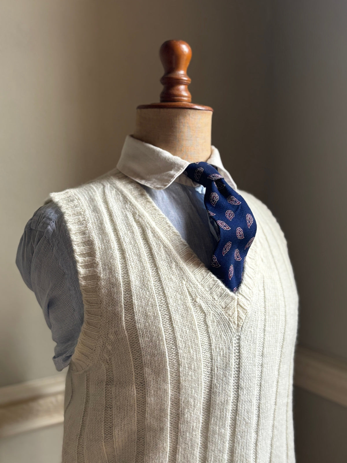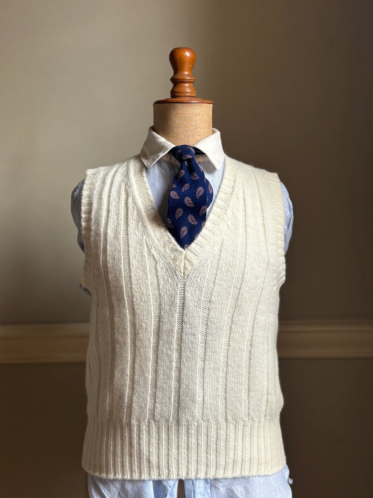 Ribbed throughout and cut short in the body with a generous deep V-neck, this piece is knitted directly from an original 1930s pattern. It’s an authentic, high-quality garment in a natural white wool—exactly the kind of vest that would have been a staple in any gentleman’s wardrobe of the era.