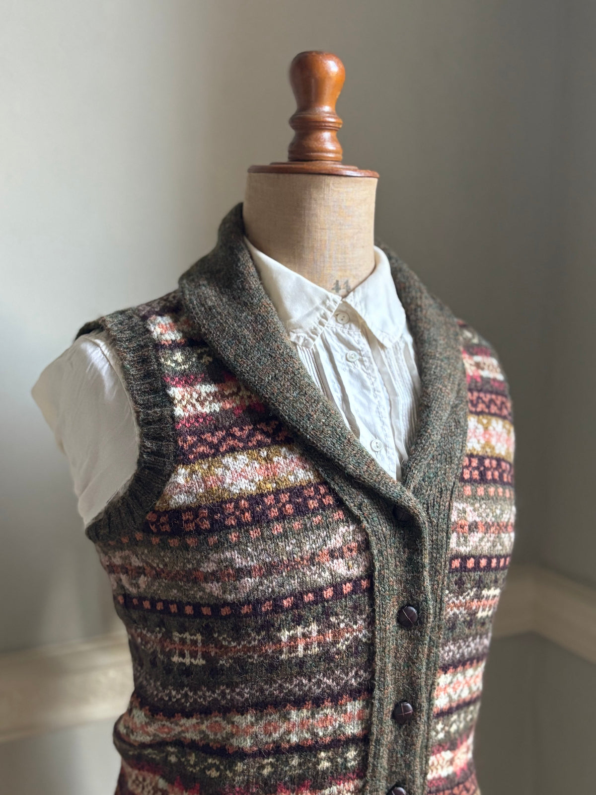 1920S "HARRY VARDON" LADIES FAIR ISLE SHAWL NECK WAISTCOAT