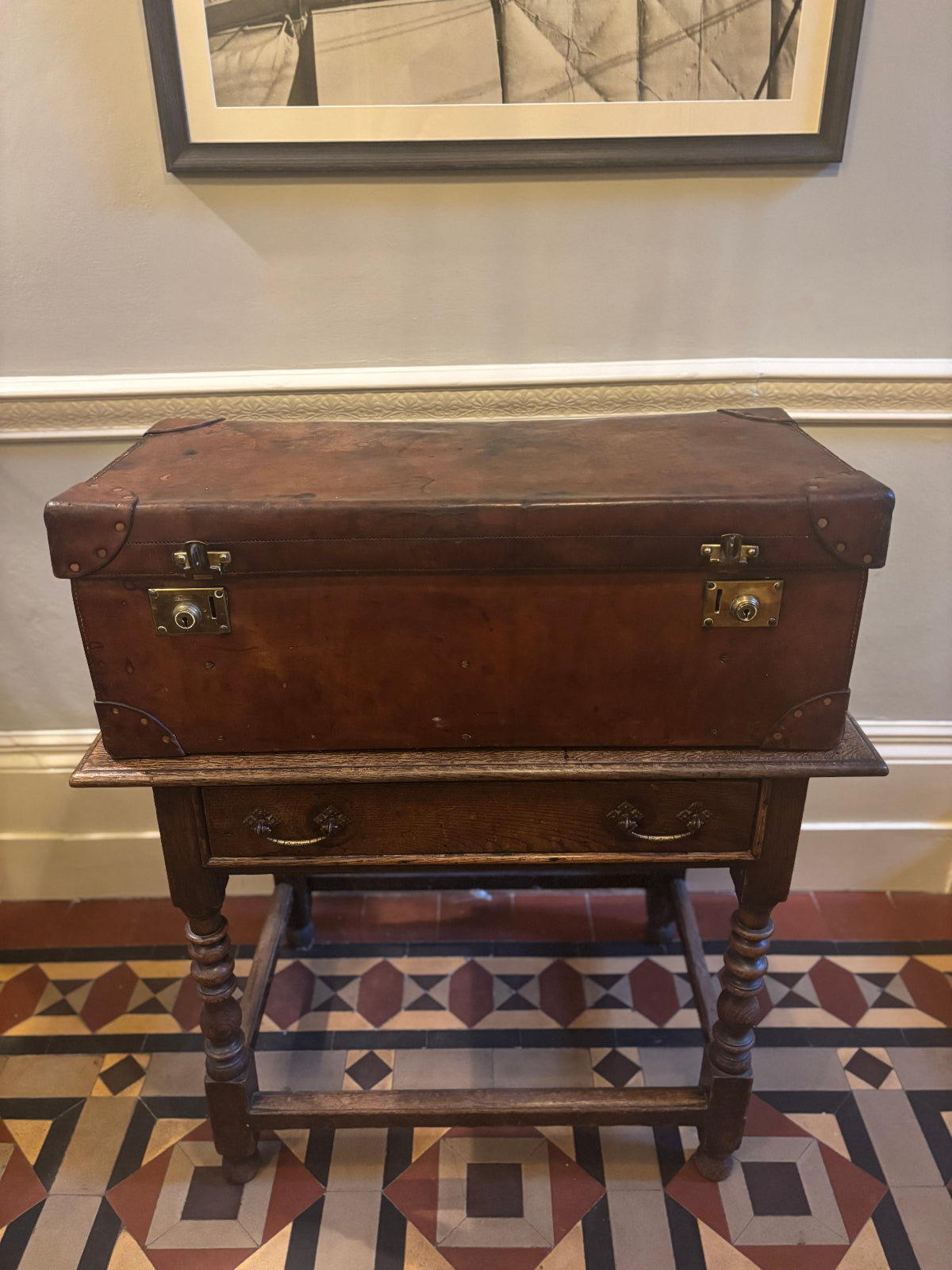 This shoe trunk is in remarkably good condition for its age. The leather has been fed and is in a nice supple state. There are no rips and tears to the case and the stitching is all intact and strong. There is a green baize lined covered tray with wooden compartments that lifts out, this tray also has a lid that sits on top. To the base of the trunk you will find further wooden compartments for shoes, again lined in green baize. Both brass locks are in working order. The leather handles at each end are held in place with solid brass fittings.