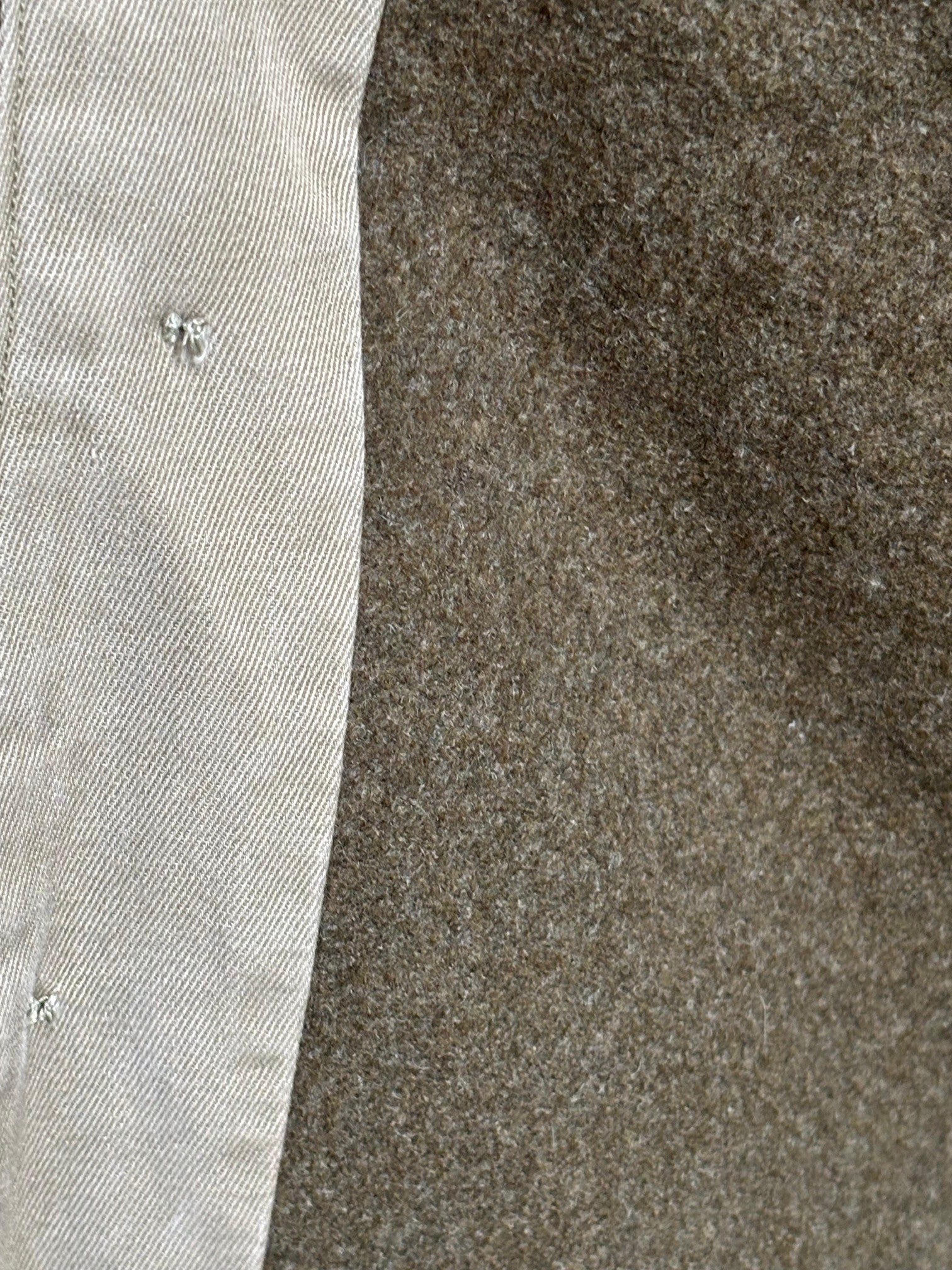 Constructed from a tightly woven cotton shell in a faded olive drab tone, the jacket features a button-front closure with a wide storm placket, slash hand pockets, and a pointed collar that can be worn open or buttoned for added protection. The cut is short and functional, designed for mobility and layering in field conditions. Lined in a green/khaki wool, blanket style lining for extra warmth.