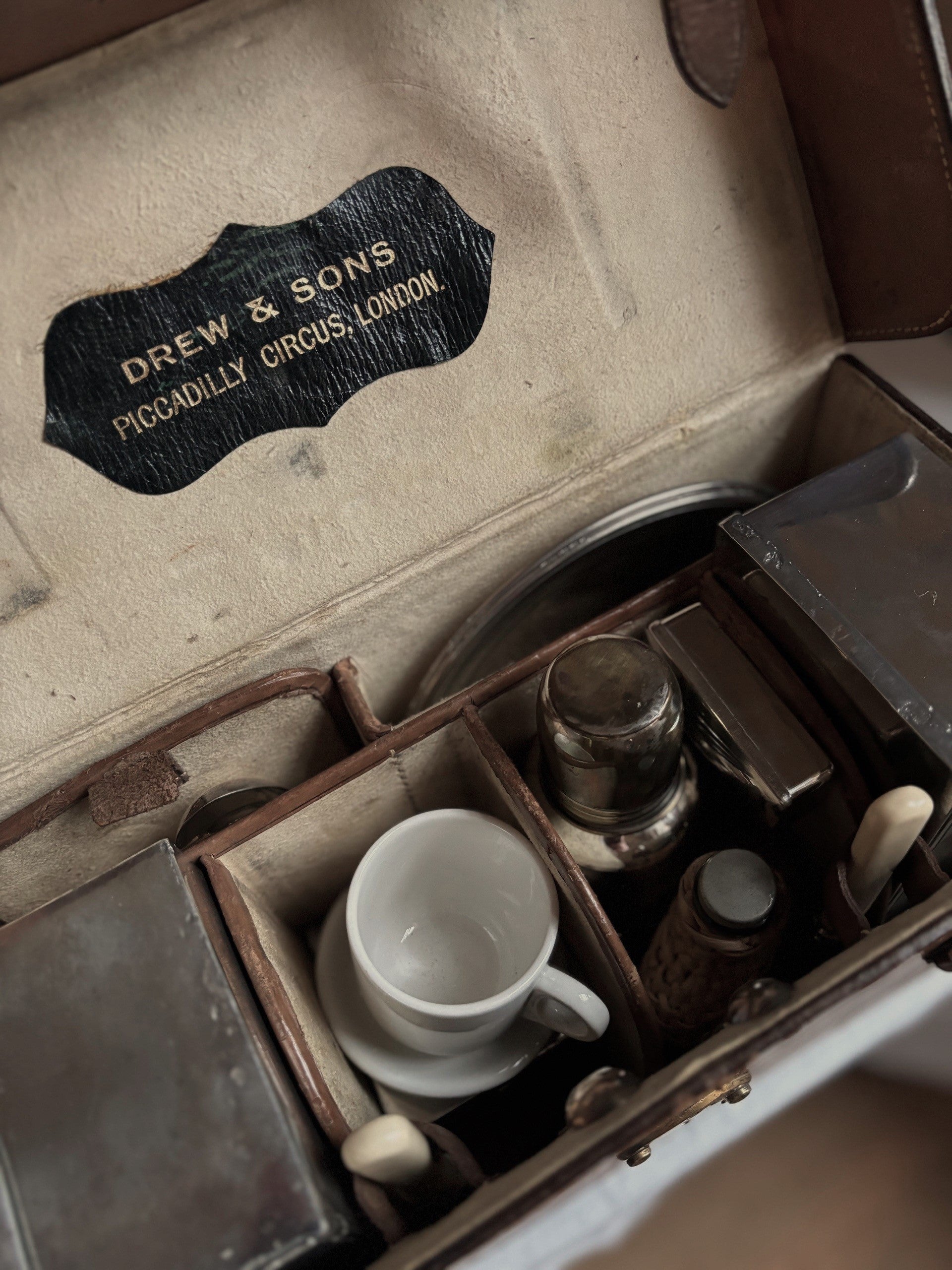 A beautifully preserved vintage leather picnic case with original picnic service for two, by Drew & Sons, Piccadilly Circus, London. A respected British maker known for producing high-quality travel and leisure goods in the late 19th and early 20th centuries. Drew & Sons built their reputation on fine materials, practical design, and craftsmanship intended for refined outdoor pursuits—picnics, motoring holidays, and country outings of the Edwardian and interwar periods.